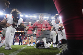 San Francisco 49ers quarterback Brock Purdy leads a prayer on the field after a preseason NFL football game against the Denver Broncos, Saturday, Aug. 9, 2025, in Santa Clara, Calif. (AP Photo/Godofredo A. Vásquez)