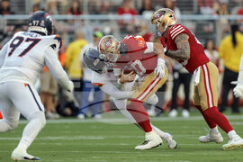 San Francisco 49ers quarterback Mac Jones (10) is sacked in the first half during a NFL football game against the Denver Broncos at Levi's Stadium in Santa Clara, Calif., on Saturday, Aug. 9, 2025. (Carlos Avila Gonzalez/San Francisco Chronicle via AP)