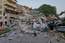 Rubble is splattered after a building collapsed during an earthquake in Sindirgi, northwest Turkey, Monday, Aug. 11, 2025. (Berkman Ulutin/Dia Photo via AP)