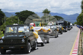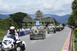 Coffin of former acting president Myint Swe covered with Myanmar National Flag, is seen on a vehicle during his funeral Monday, Aug. 11, 2025, in Naypyitaw, Myanmar. (AP Photo/Aung Shine Oo)