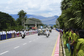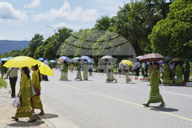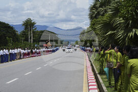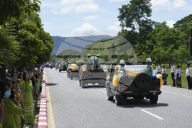 People stand beside a road while convey carrying coffin of former acting president Myint Swe during his funeral Monday, Aug. 11, 2025, in Naypyitaw, Myanmar. (AP Photo/Aung Shine Oo)