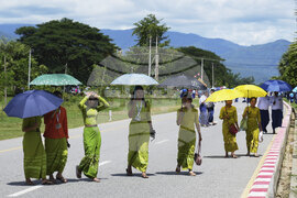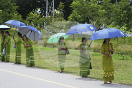 People leave after they paid respect to coffin of former acting president Myint Swe during his funeral Monday, Aug. 11, 2025, in Naypyitaw, Myanmar. (AP Photo/Aung Shine Oo)