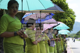 People stand beside a road as they wait to pay respect coffin of former acting president Myint Swe during his funeral Monday, Aug. 11, 2025, in Naypyitaw, Myanmar. (AP Photo/Aung Shine Oo)