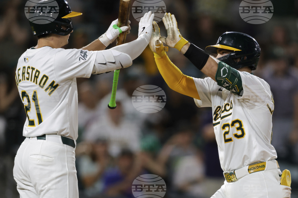 Athletics' Shea Langeliers, right, celebrates with Tyler Soderstrom after hitting a one-run home run during the fifth inning of a baseball game against the Tampa Bay Rays Monday, Aug. 11, 2025, in West Sacramento, Calif. (AP Photo/Sergio Estrada)