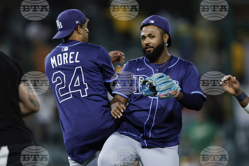 Tampa Bay Rays third baseman Junior Caminero, right, celebrates with Christopher Morel after a baseball game against the Athletics Monday, Aug. 11, 2025, in West Sacramento, Calif. (AP Photo/Sergio Estrada)