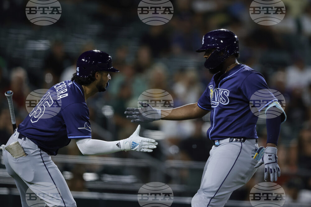 Tampa Bay Rays' Junior Caminero, right, celebrates with Everson Pereira, left, after hitting a one-run home run during the seventh inning of a baseball game against the Athletics Monday, Aug. 11, 2025, in West Sacramento, Calif. (AP Photo/Sergio Estrada)