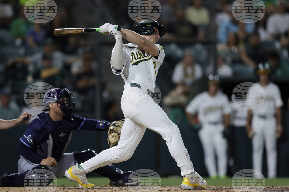Tampa Bay Rays' Nick Fortes hits an RBI single during the second inning of a baseball game against the Athletics, Monday, Aug. 11, 2025, in West Sacramento, Calif. (AP Photo/Sergio Estrada)