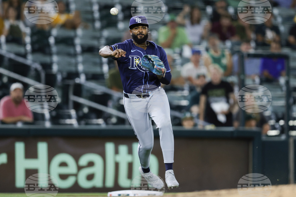 Tampa Bay Rays third baseman Junior Caminero throws to first base for the final out of a baseball game against the Athletics Monday, Aug. 11, 2025, in West Sacramento, Calif. (AP Photo/Sergio Estrada)