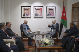 Jordan's Foreign Minister Ayman Safadi, center right, meets with U.S. Ambassador to Turkey and Special Envoy to Syria Tom Barrack, center left, in Amman, Jordan, Tuesday, Aug. 12, 2025. (AP Photo/Delara Shakib)