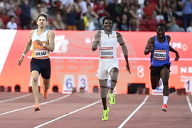 Muzala Samukonga of Zambia, center, is on his way to winning the final of the men's 400-meterevent next to Attila Molnar of Hungary, left, and Rusheen McDonald of Jamaicaat the 15th Gyulai Istvan Memorial Track and Field Hungarian Grand Prix in the National Athletics Center in Budapest, Hungary, Tuesday, Aug. 12, 2025. (Boglarka Bodnar/MTI via AP)