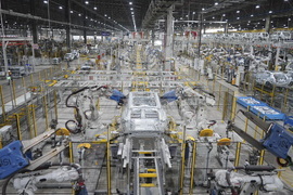 FILE - A car frame is being welded by robots at a Vinfast factory in Hai Phong, Vietnam on Sept. 29, 2023. (AP Photo/Hau Dinh, File)