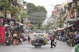 FILE- A vendor pushes a cart full of shoes across the street in the Old Quarter of Hanoi, Vietnam, April 24, 2025. (AP Photo/Hau Dinh, File)