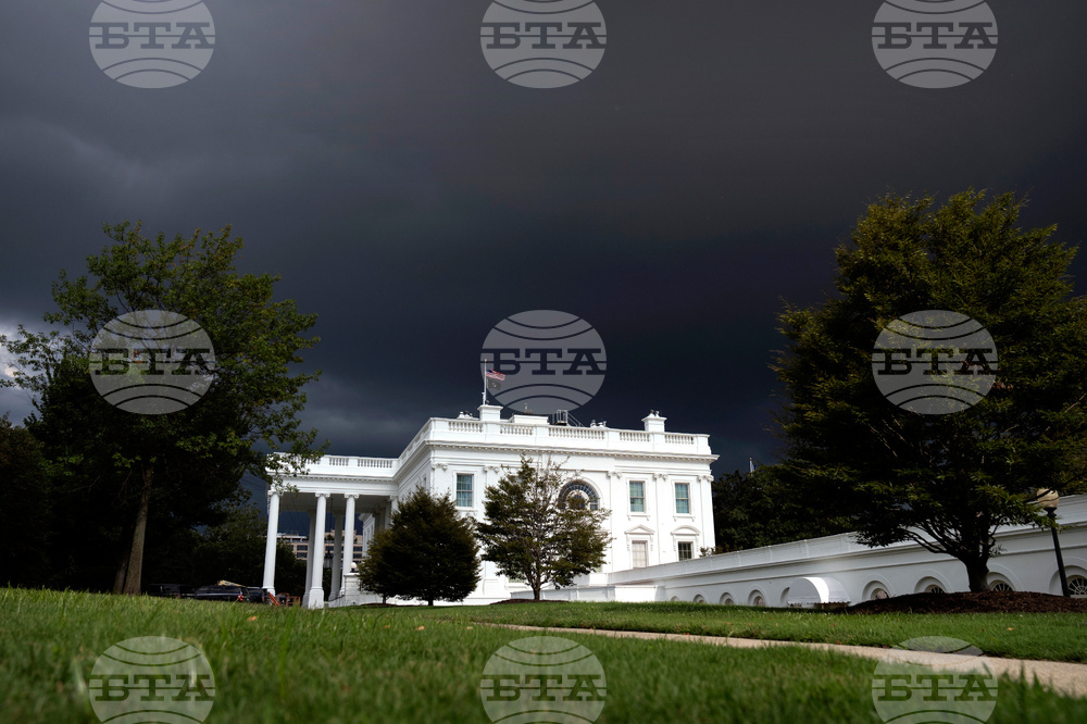 Dark clouds are seen in the sky behind the White House, Thursday, Aug. 14, 2025, in Washington. (AP Photo/Mark Schiefelbein)