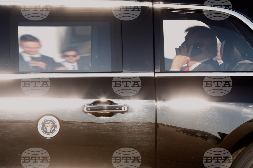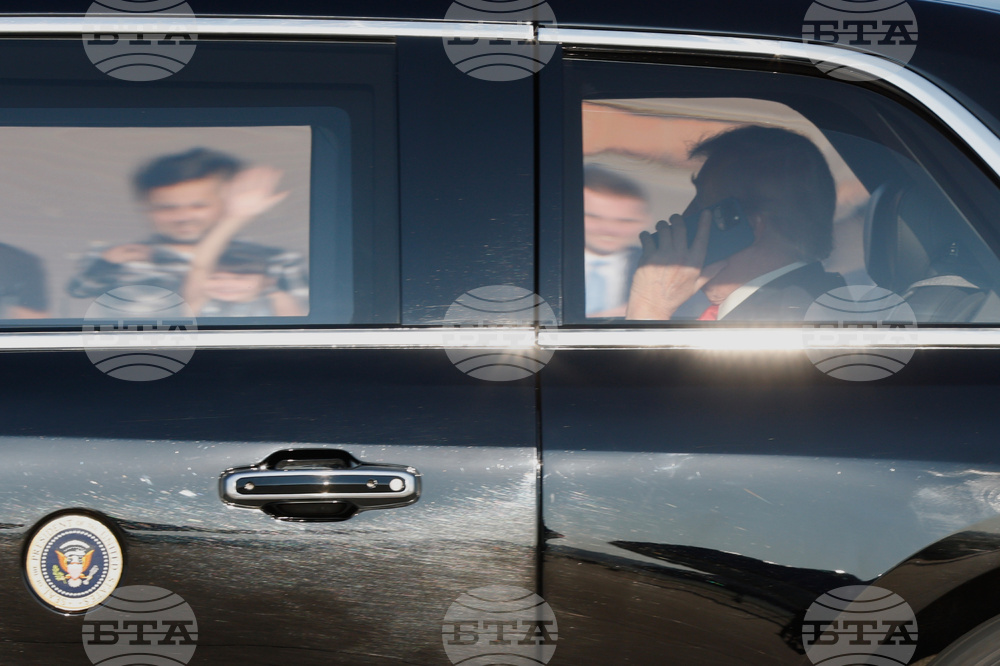 President Donald Trump, right, talks on a mobile phone in his limousine upon his arrival at Joint Base Andrews, Md., Friday, August 15, 2025, en route to a meeting with Russian President Vladimir Putin in Alaska. (AP Photo/Luis M. Alvarez)