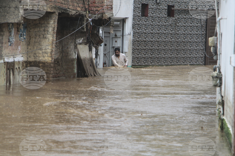 A resident navigates through a flooded street following flash flooding due to heavy rains at a neighbourhood of Mingora, the main town of Swat Valley, northwestern Pakistan, Friday, Aug. 15, 2025. (AP Photo/Naveed Ali)