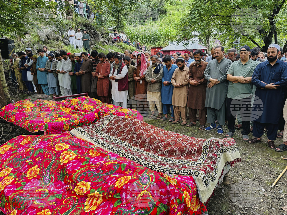 People attend funeral prayers of the victims of a cloudburst incident, sudden intense downpours, in Naryan Behak village near Muzaffarabad, the main town of Pakistan's controlled Kashmir, Friday, Aug. 15, 2025. (AP Photo/M.D. Mughal)