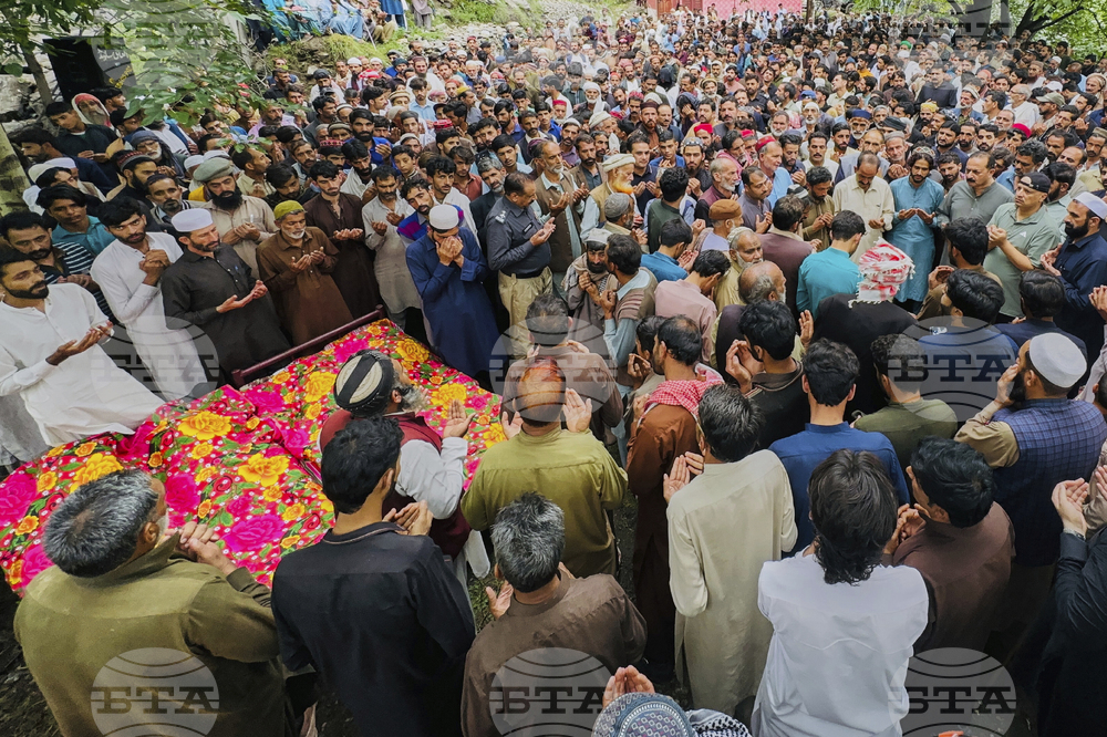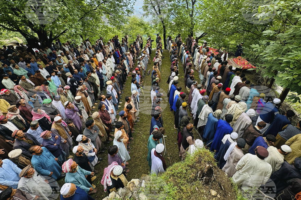People attend funeral prayers of the victims of cloudburst incident, sudden intense downpours, in Naryan Behak village near Muzaffarabad, the main town of Pakistan's controlled Kashmir, Friday, Aug. 15, 2025. (AP Photo/M.D. Mughal)
