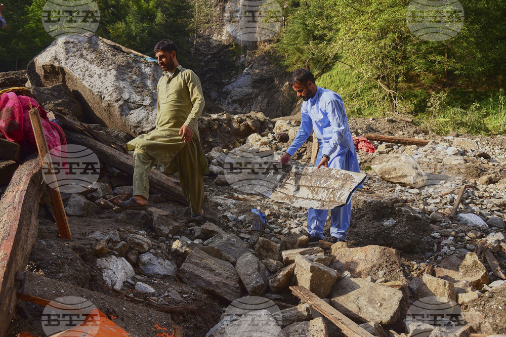 In this photo released by Rescue 1122 Emergency Department, rescue workers and local residents recover a body at the site of flash flood incident in a village of Battagram district, Khyber Pakhtunkhwa province, Pakistan Friday, Aug. 15, 2025. (Rescue 1122 Emergency Department via AP)