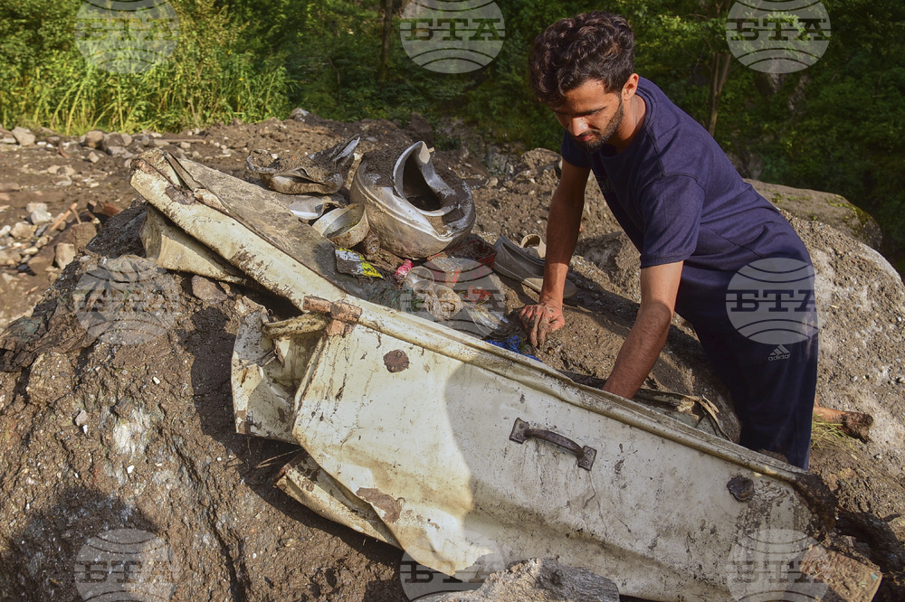 A villager collects useful items from a iron suitcase recovering from a damaged house at the incident site of cloudburst that triggered flash flood, in Naryan Behak village near Muzaffarabad, the main town of Pakistan's controlled Kashmir, Friday, Aug. 15, 2025. (AP Photo/M.D. Mughal)