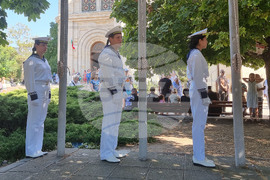 Варна (15 август 2025) Варна отбелязва днес празника си Свето Успение Богородично. Варненският и Великопреславски митрополит Йоан (вдясно) отслужва тържествена света литургия в катедралния храм в града. След това тържествено се издига флагът на Варна.