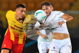Lecce's Nikola Krstovic, left, and Juve Stabia's Marco Bellich, right, battle for the ball during an Italian Cup soccer match between US Lecce and SS Juve Stabia at the Via del Mare Stadium in Lecce, Italy, Friday, Aug. 15, 2025. (Giovanni Evangelista/LaPresse via AP)