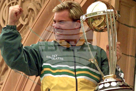 FILE - Australia's Shane Warne clenches his fist as he holds the Cricket World Cup Trophy on the team balcony at Lords after Australia defeated Pakistan by 8 wickets in the final of the Cricket World Cup, in London Sunday, June 20, 1999. (AP Photo/Rui Vieira, File)
