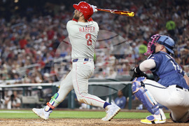 Philadelphia Phillies' Bryce Harper takes a swing during the seventh inning of a baseball game against the Washington Nationals, Friday, Aug. 15, 2025, in Washington. (AP Photo/Daniel Kucin Jr.)