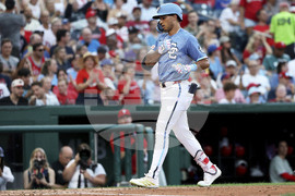 Philadelphia Phillies'J.T. Realmuto uses a themed bat during his at bat in the ninth inning of a baseball game against the Washington Nationals, Saturday, Aug. 16, 2025, in Washington. (AP Photo/Nick Wass)