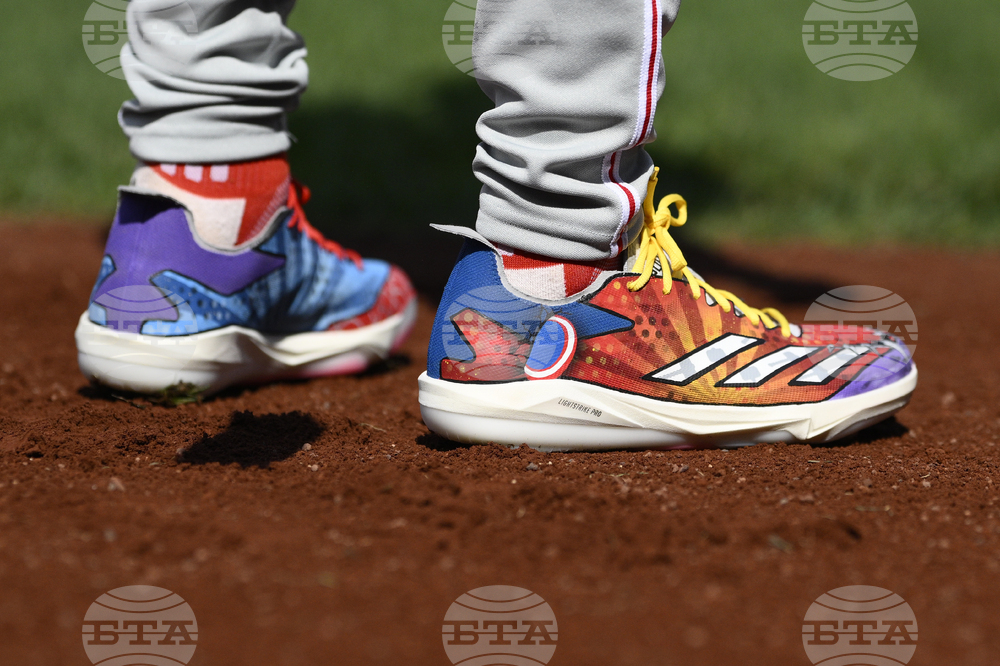 Philadelphia Phillies' Trea Turner wears custom themed cleats before a baseball game against the Washington Nationals, Saturday, Aug. 16, 2025, in Washington. (AP Photo/Nick Wass)
