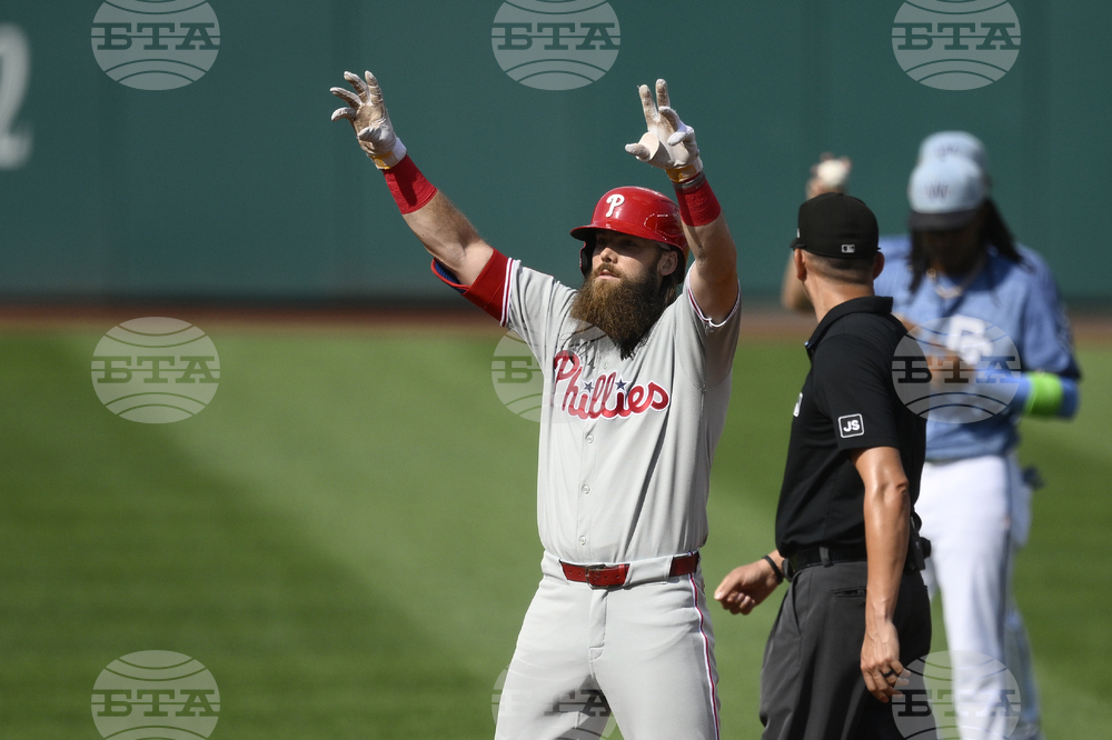 Philadelphia Phillies' Brandon Marsh gestures at second base after hitting a double in the second inning of a baseball game against the Washington Nationals, Saturday, Aug. 16, 2025, in Washington. (AP Photo/Nick Wass)