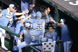 Philadelphia Phillies' Kyle Schwarber celebrates with his teammates after hitting a home run during the seventh inning of a baseball game against the Washington Nationals, Friday, Aug. 15, 2025, in Washington. (AP Photo/Daniel Kucin Jr.)