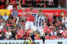 West Bromwich Albion's Karlan Grant, left, and Wrexham's Ryan Barnett in action during the Championship soccer match between AFC Wrexham and West Bromwich Albion in Wrexham, Wales, Saturday Aug. 16, 2025. (Cody Froggatt/PA via AP)