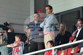 Wrexham co-owners Rob McElhenney and Ryan Reynolds, center right, in the stands during the Championship soccer match between AFC Wrexham and West Bromwich Albion in Wrexham, Wales, Saturday Aug. 16, 2025. (Cody Froggatt/PA via AP)