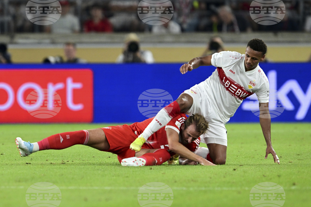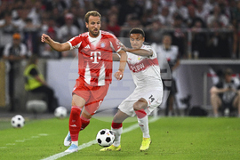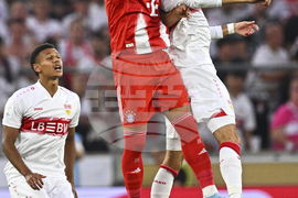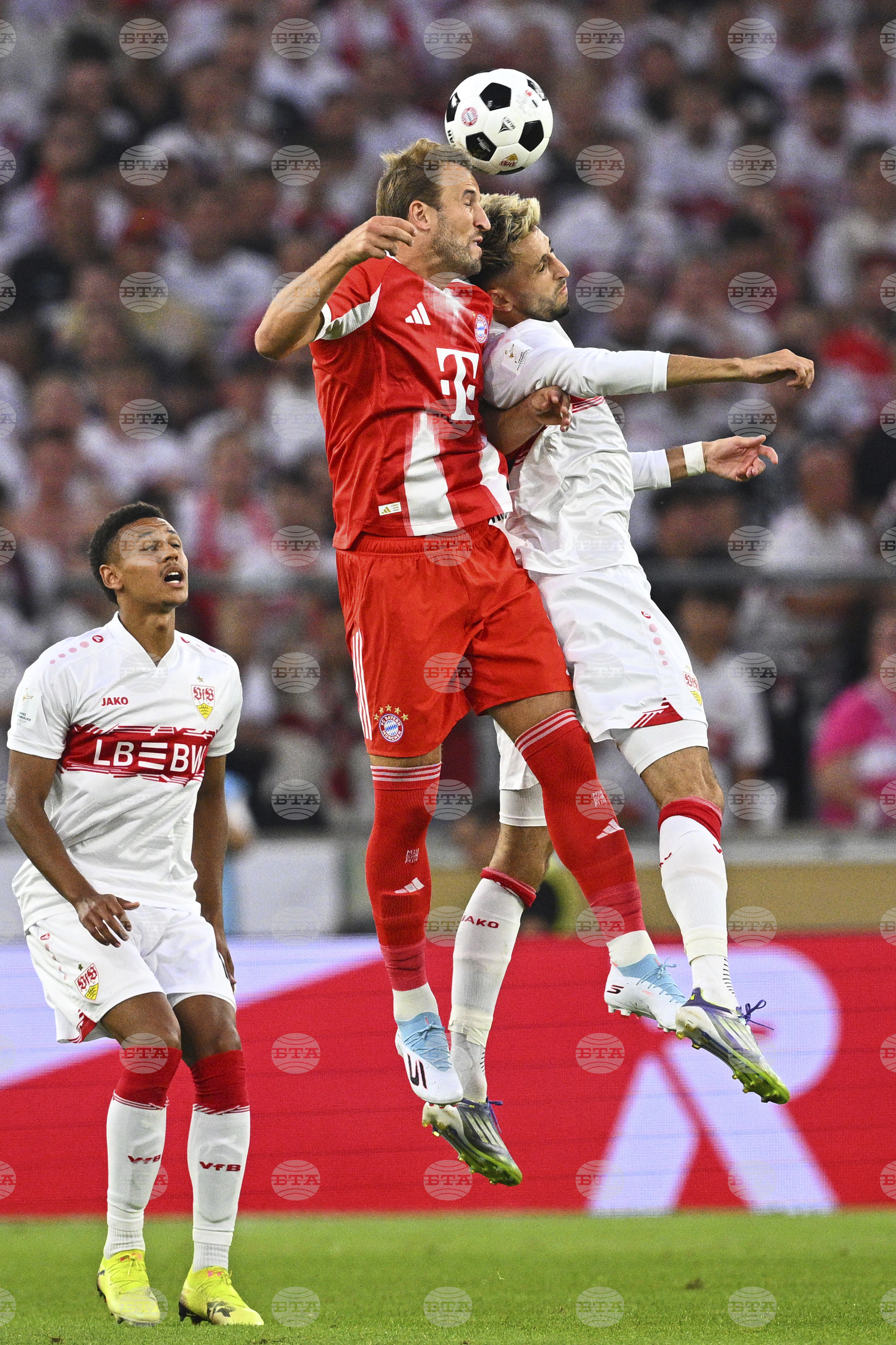 Bayern's Harry Kane, left, and Stuttgart's Luca Jaquez challenge for the ball during the German Super Cup final soccer match between VfB Stuttgart and Bayern Munich in Stuttgart, Germany, Saturday, Aug. 16, 2025. (Bernd Weißbrod/dpa via AP)
