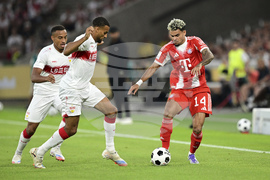 Bayern's Josip Stanisic, right, and Stuttgart's Jamie Leweling challenge for the ball during the German Super Cup final soccer match between VfB Stuttgart and Bayern Munich in Stuttgart, Germany, Saturday, Aug. 16, 2025. (Tom Weller/dpa via AP)
