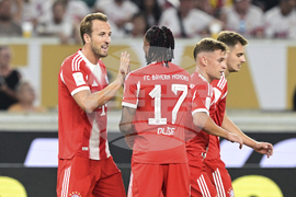 Bayern's Harry Kane, right, celebrates with teammates after scoring the opening goal during the German Super Cup final soccer match between VfB Stuttgart and Bayern Munich in Stuttgart, Germany, Saturday, Aug. 16, 2025. (Tom Weller/dpa via AP)