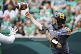 Hamilton Tiger-Cats quarterback Bo Levi Mitchell (19) throws against the Saskatchewan Roughriders during the first half of CFL football game in Regina, Saskatchewan, Saturday, Aug. 16, 2025. (Heywood Yu/The Canadian Press via AP)