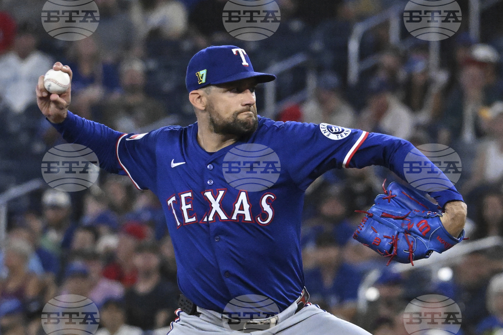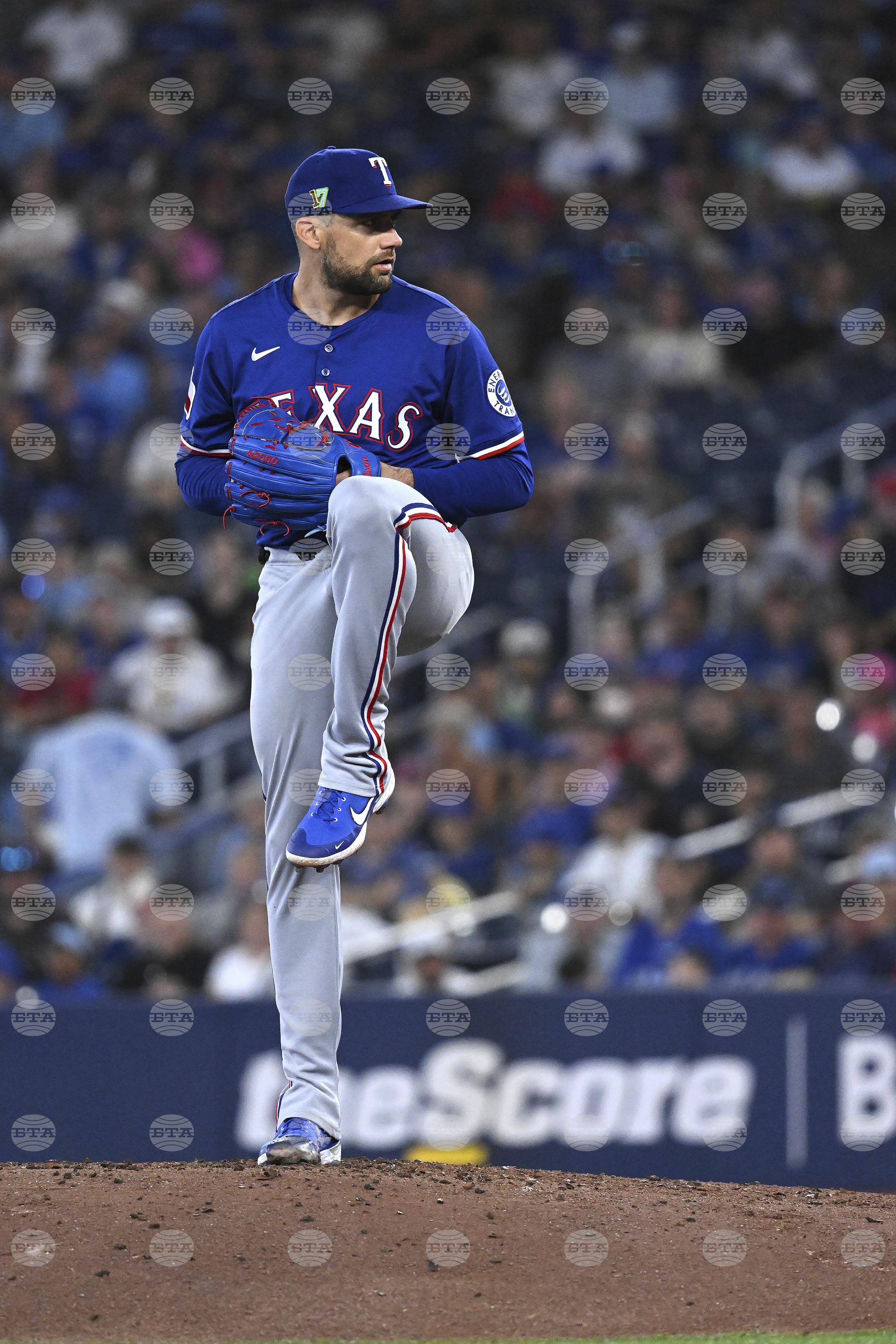 Texas Rangers starting pitcher Nathan Eovaldi throws to a Toronto Blue Jays batter in first-inning baseball game action in Toronto, Sunday, Aug. 17, 2025. (Jon Blacker/The Canadian Press via AP)