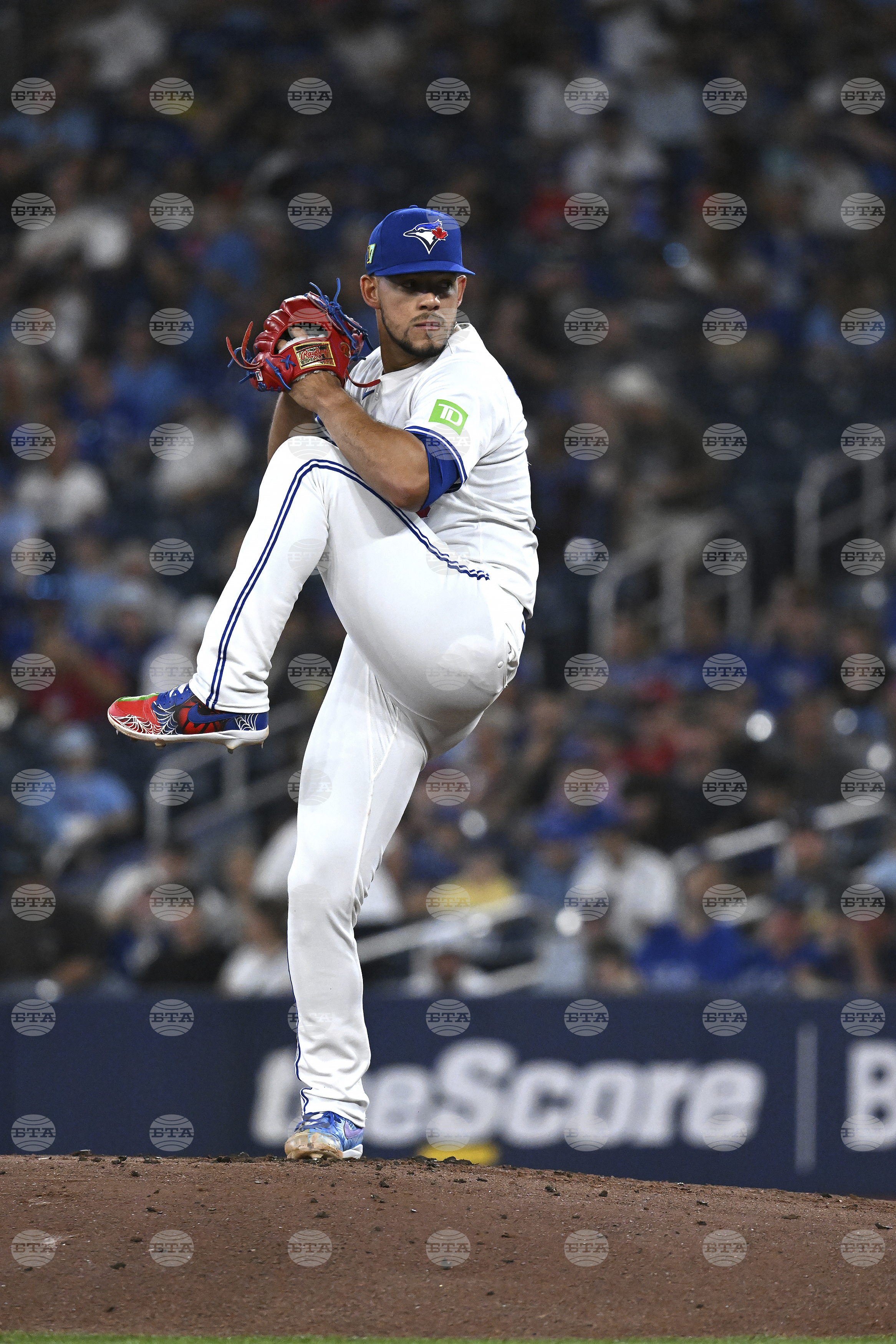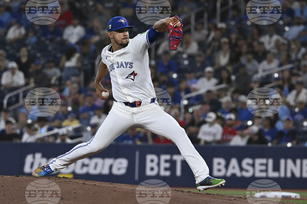 Toronto Blue Jays starting pitcher Jose Berrios throws to a Texas Rangers batter in first-inning baseball game action in Toronto, Sunday, Aug. 17, 2025. (Jon Blacker/The Canadian Press via AP)