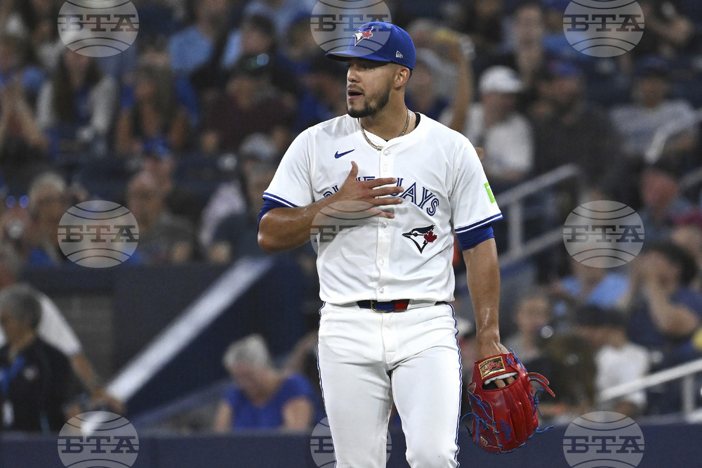 Toronto Blue Jays starting pitcher Jose Berrios reacts after making the final out of the first inning against the Texas Rangers in baseball game action in Toronto, Sunday, Aug. 17, 2025. (Jon Blacker/The Canadian Press via AP)
