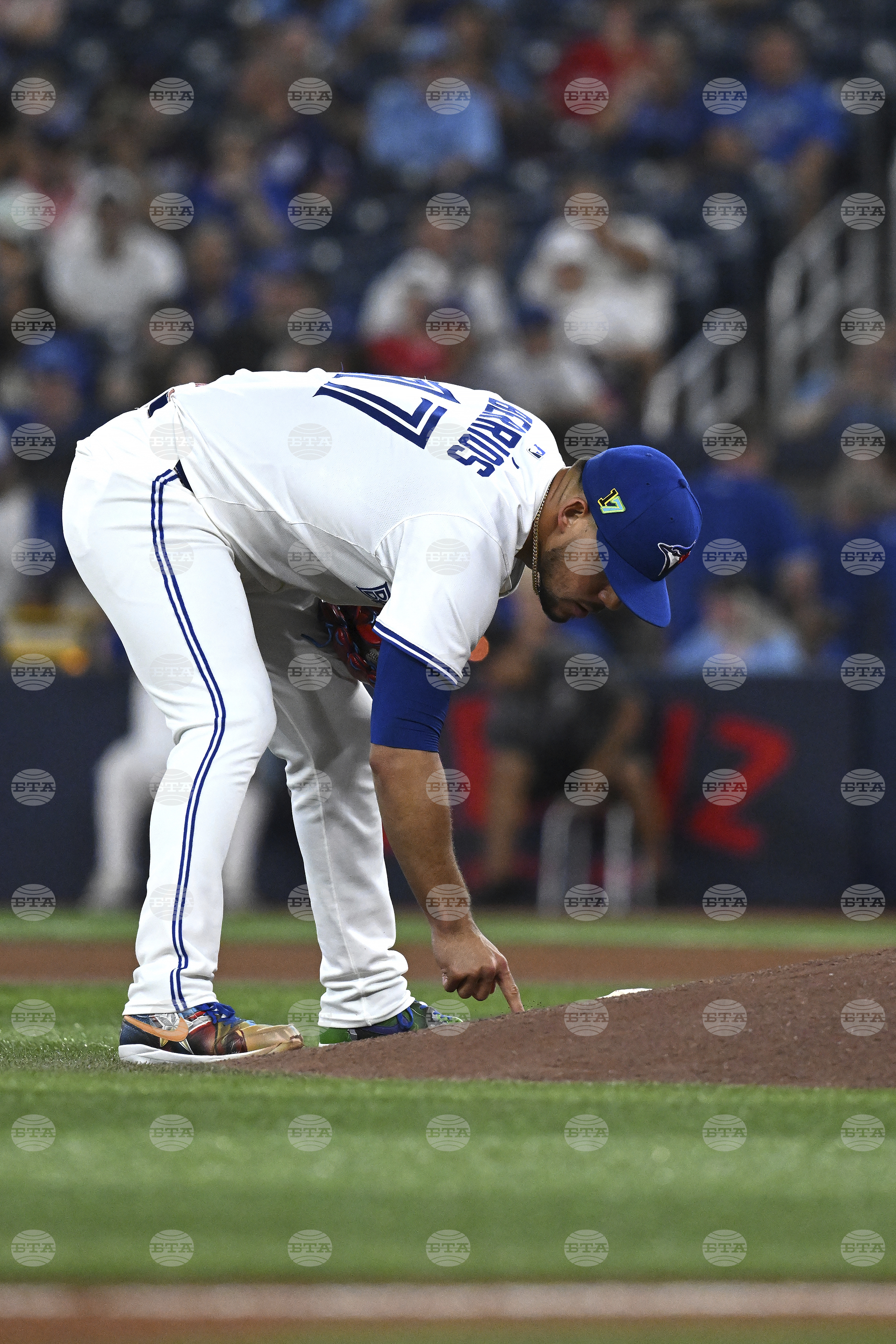 Toronto Blue Jays starter Jose Berrios writes in the dirt of the pitcher's mound before throwing the first pitch of a baseball game against the Texas Rangers in Toronto, Sunday, Aug. 17, 2025. (Jon Blacker/The Canadian Press via AP)