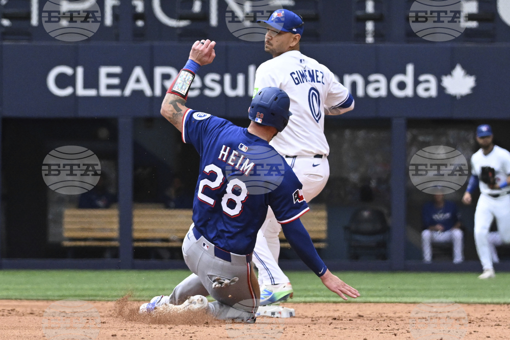 Toronto Blue Jays second baseman Andres Gimenez (0) forces out Texas Rangers' Jonah Heim (28) during sixth-inning baseball game action in Toronto, Sunday, Aug. 17, 2025. (Jon Blacker/The Canadian Press via AP)