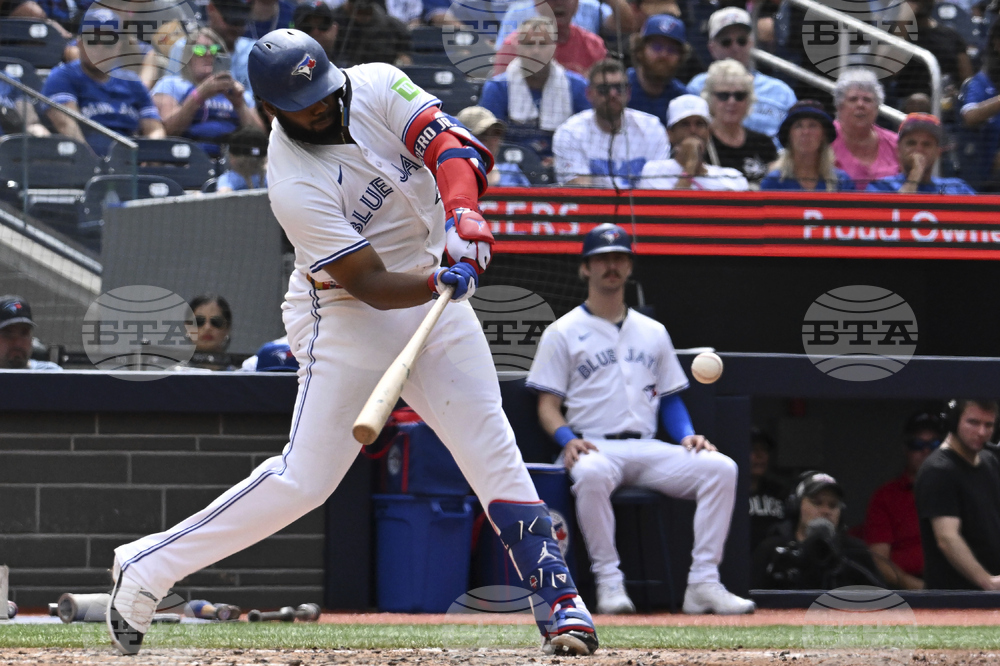 Toronto Blue Jays' Vladimir Guerrero Jr. hits a single against the Texas Rangers in first-inning baseball game action in Toronto, Sunday, Aug. 17, 2025. (Jon Blacker/The Canadian Press via AP)