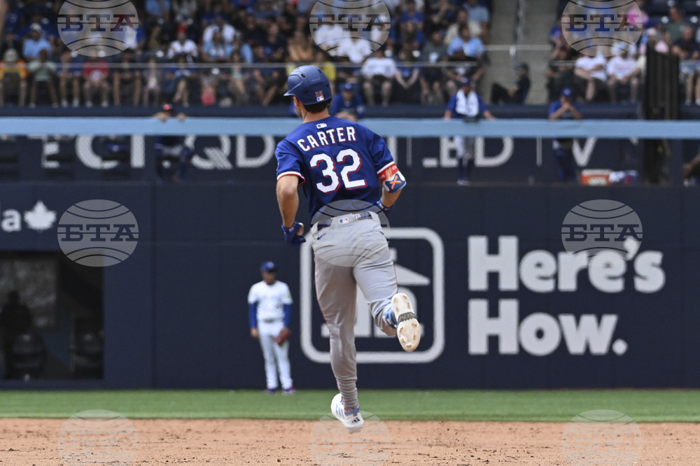 Texas Rangers' Evan Carter runs the bases after hitting a two-run home run, also scoring Corey Seager, in ninth-inning baseball game action in Toronto, Sunday, Aug. 17, 2025. (Jon Blacker/The Canadian Press via AP)