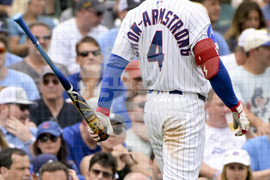 Chicago Cubs' Pete Crow-Armstrong uses a custom bat for Players' Weekend during the fourth inning of a baseball game Pittsburgh Pirates, Sunday, Aug. 17, 2025, at Wrigley Field in Chicago. (AP Photo/Mark Black)