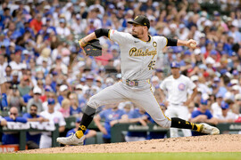 Pittsburgh Pirates pitcher Andrew Heaney throws against the Chicago Cubs during the fifth inning of a baseball game, Sunday, Aug. 17, 2025, at Wrigley Field in Chicago. (AP Photo/Mark Black)