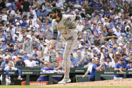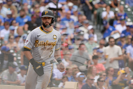 Pittsburgh Pirates' Isiah Kiner-Falefa scores during the third inning of a baseball game against the Chicago Cubs, Sunday, Aug. 17, 2025, at Wrigley Field in Chicago. (AP Photo/Mark Black)