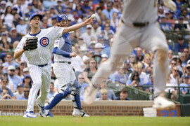 Pittsburgh Pirates pitcher Carmen Mlodzinski tosses to first base for an out against Chicago Cubs' Michael Busch during the third inning of a baseball game, Sunday, Aug. 17, 2025, at Wrigley Field in Chicago. (AP Photo/Mark Black)