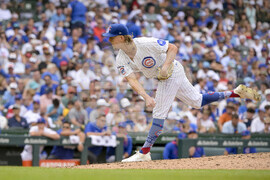 Chicago Cubs pitcher Ben Brown throws against the Pittsburgh Pirates during the eighth inning of a baseball game, Sunday, Aug. 17, 2025, at Wrigley Field in Chicago. (AP Photo/Mark Black)