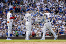Chicago Cubs Ian Happ scores on a triple by Dansby Swanson during the fifth inning of a baseball game, Sunday, Aug. 17, 2025, at Wrigley Field in Chicago. (AP Photo/Mark Black)